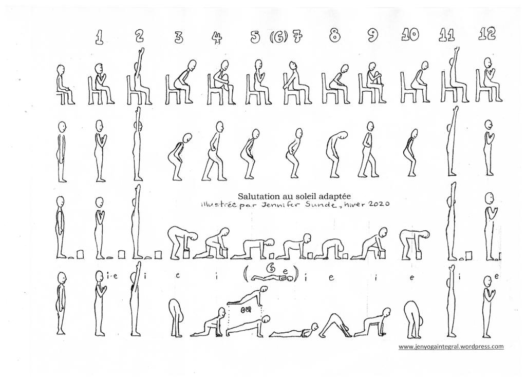 Il existe plusieurs versions de la salutation au soleil. Voici une image qui montre la même salutation au soleil (12 postures), adaptée de 4 façons différentes, soit : 1) sur chaise : excellent pour s’étirer et respirer plus profondément tout en restant assis sur une chaise 2) debout : excellent pour renforcer les cuisses et travailler l’équilibre 3) au sol avec bloc et sans posture inversée : excellent pour maintenir la capacité de descendre et se relever 4) au sol avec postures inversées : excellent pour relâcher les tensions au cou et masser les organes internes.
