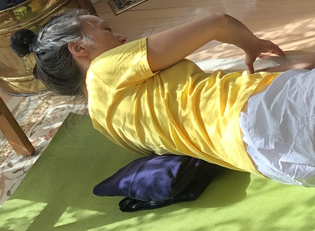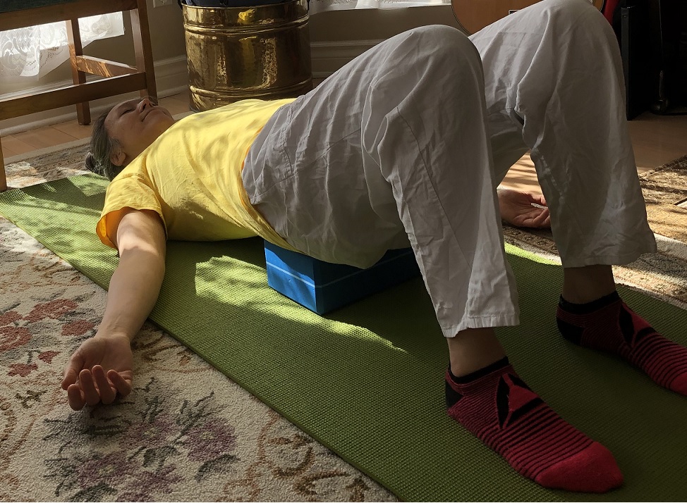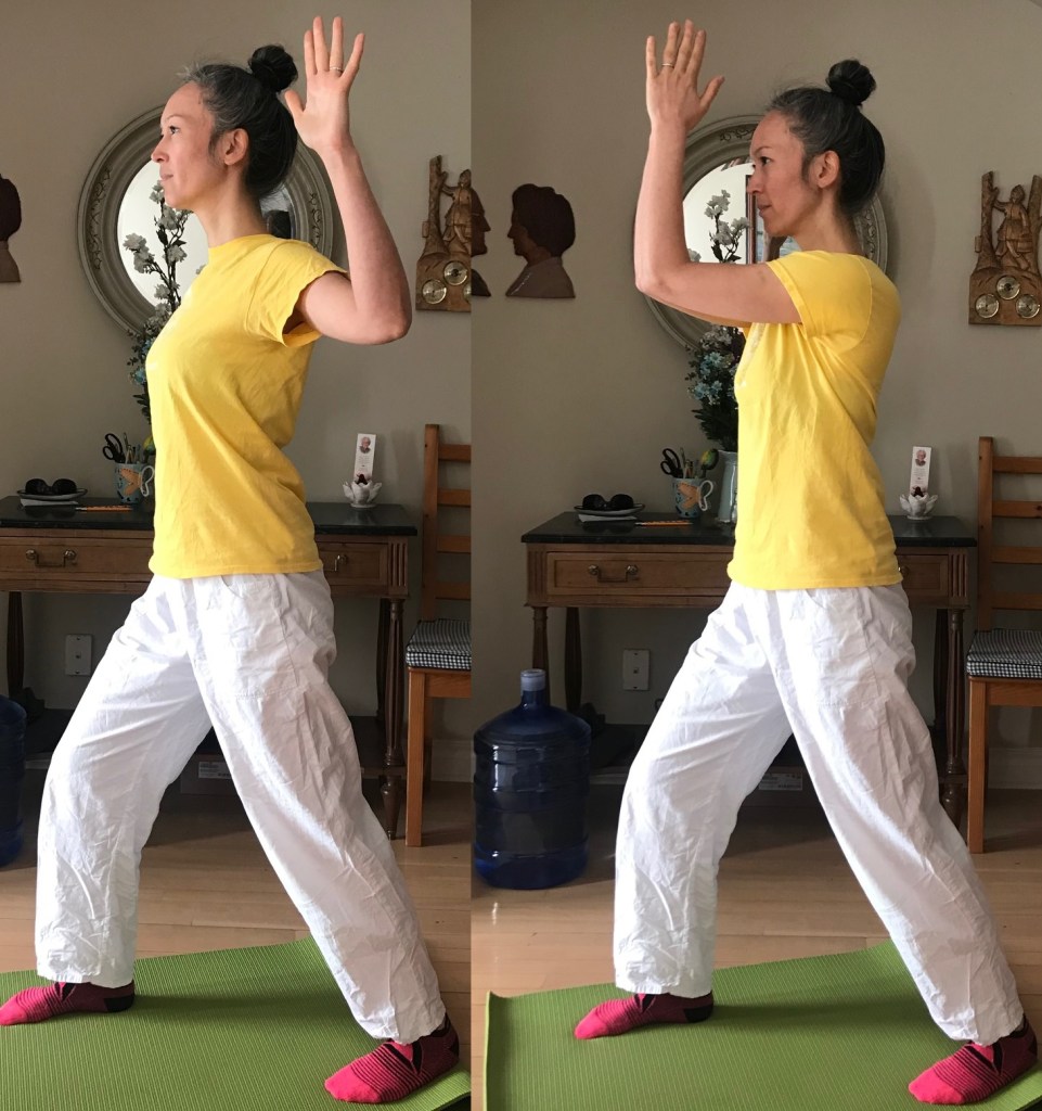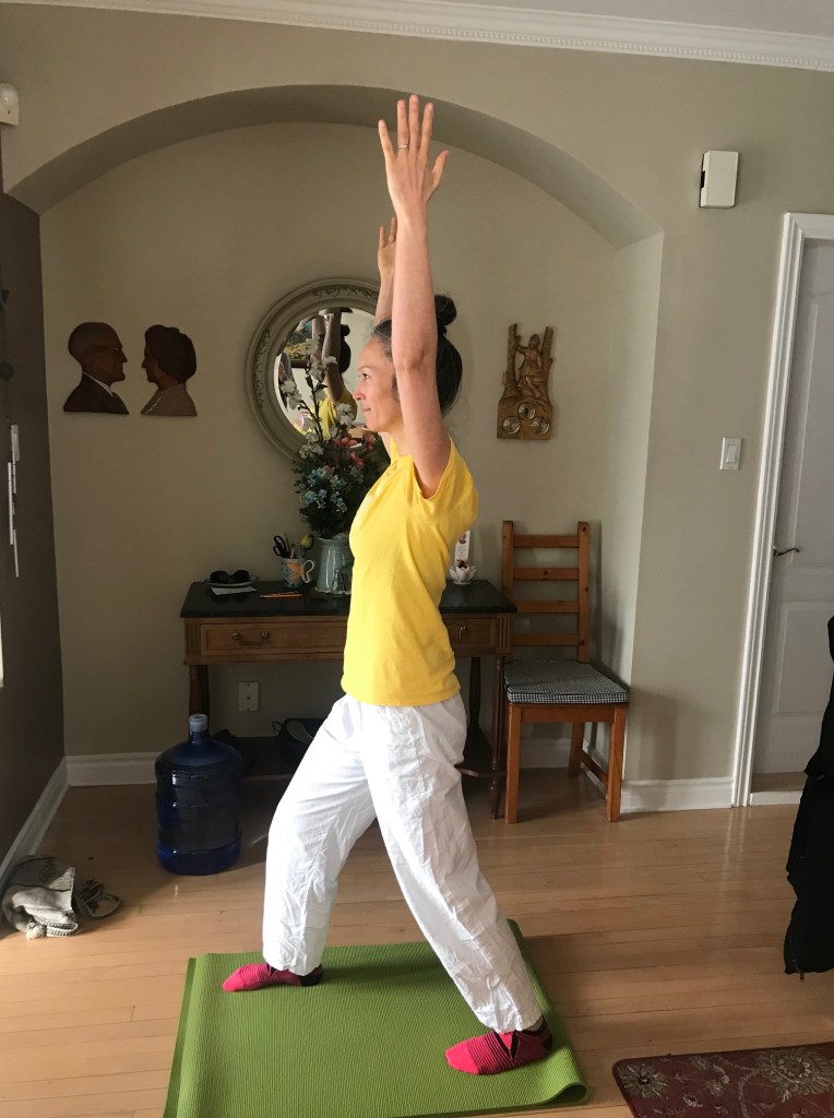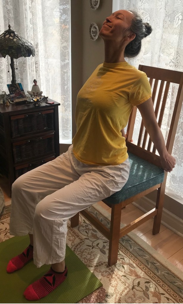 La demi-lune, soit debout ou sur chaise : Quand cette posture est fait en rythme avec la respiration, elle devient un exercice d’échauffement. Elle aide à créer de l’espace aux organes internes, étire le diaphragme et les muscles intercostaux et grandit la colonne. En inspirant par le nez, lever tranquillement un bras au-dessus de la tête allongeant tout le dos comme si vous vouliez toucher le plafond avec le bout des doigts avant de cambrer légèrement sur le côté (visualiser l’épaule s’éloigner de votre hanche); ouvrez le flanc sans fermer l’autre flanc; et à l’expire revenir au centre. Continuez 5 à 10 fois en alternant. Observez les effets de ce mouvement. Souvent les élèves disent qu’ils se sentent comme s’ils ont grandi d’un pouce! (Voir la vidéo ici). Note : Éviter en cas de scoliose.