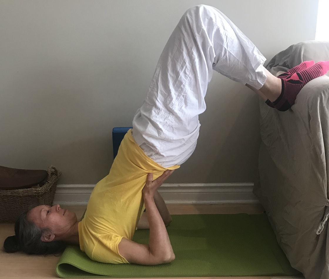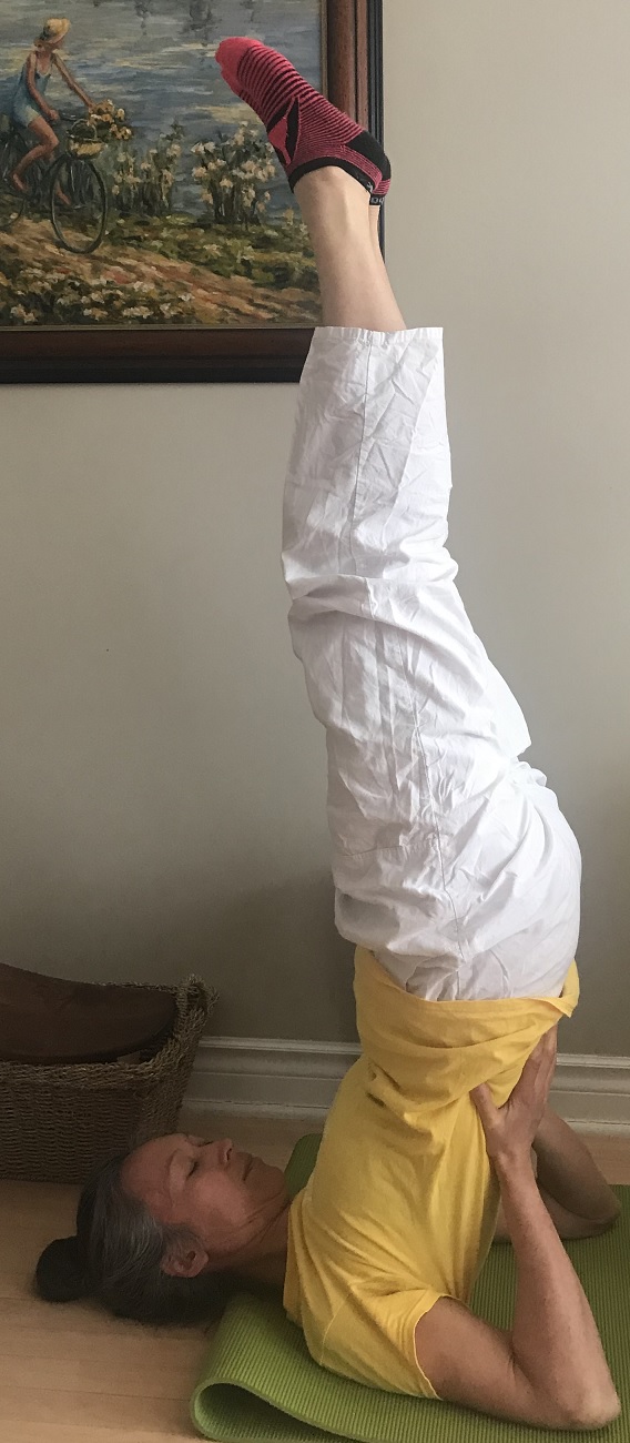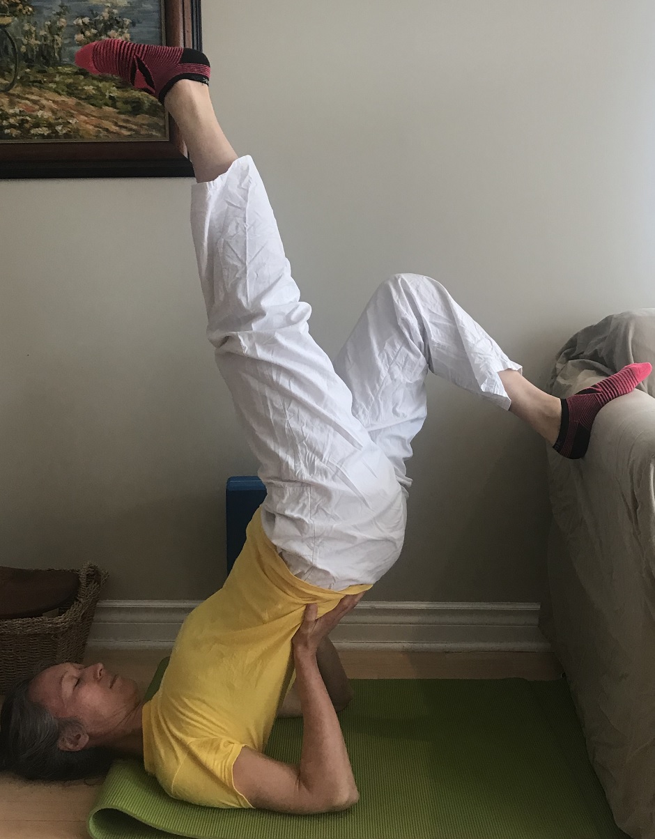 Étape 1 : Déposer le bas des jambes sur un divan ou une chaise. Étape 2 : Allonger les jambes contre un mur. Étape 3 : Placer un coussin ou un bloc sous le bassin. Étape 4 : Soulever 1 jambe (alterner) puis les 2 jambes en équilibre sur un bloc. Étape 5* : Pousser sur le mur ou le bord d’un divan (quelque chose qui ne se dérobera pas) pour soulever les hanches et poser les mains à plat sous les hanches. Étape 6* : A partir de l’étape 5, allonger 1 jambe puis l’autre en alternant. Étape 7* : La pleine posture de la chandelle. À partir du sol, soulever les 2 jambes et, avec un mini-élan, passer les jambes au-delà de la tête, poser les mains à plat contre le bas du dos et, lentement, allonger les jambes à la verticale. Pour sortir de la posture, ramener les jambes parallèles au sol, poser les mains au sol comme des freins, dérouler le dos en gardant la tête au sol, déposer les jambes au sol et relaxer. *Dans les étapes 5, 6 et 7 le cou s’étire au maximum, donc il ne faut pas tourner la tête!