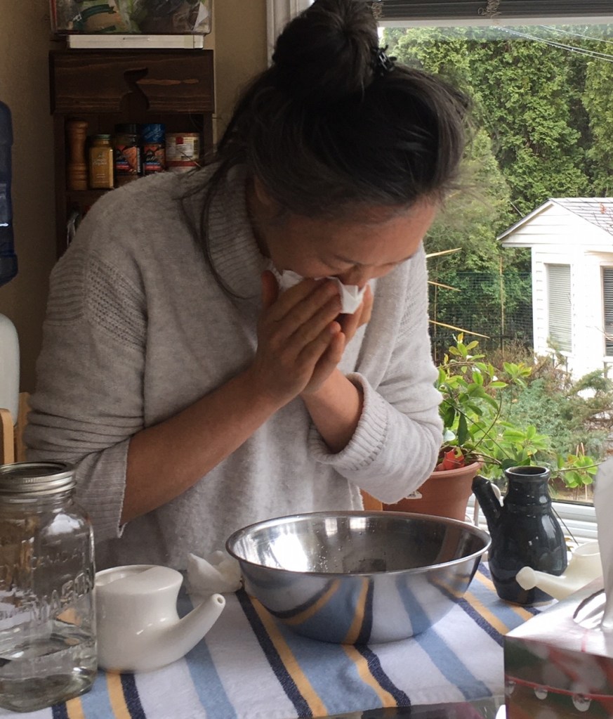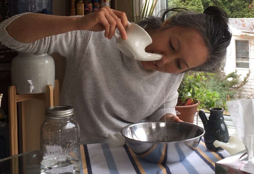 Méthode : Ayez votre matériel à portée de main. Au-dessus d’un lavabo, penchez votre tête sur le côté et appuyez le bec du lota contre la narine du haut. Laissez couler l’eau saline. Parfois le passage vers la narine du bas est fermé et il faut attendre quelques secondes et parfois ça ne passe pas. Ne forcez rien. Versez 1/3 de l’eau puis mouchez-vous. Faites l’autre narine. Alternez jusqu’à ce que le pot soit vide. Voir de nouveau le vidéo ici.