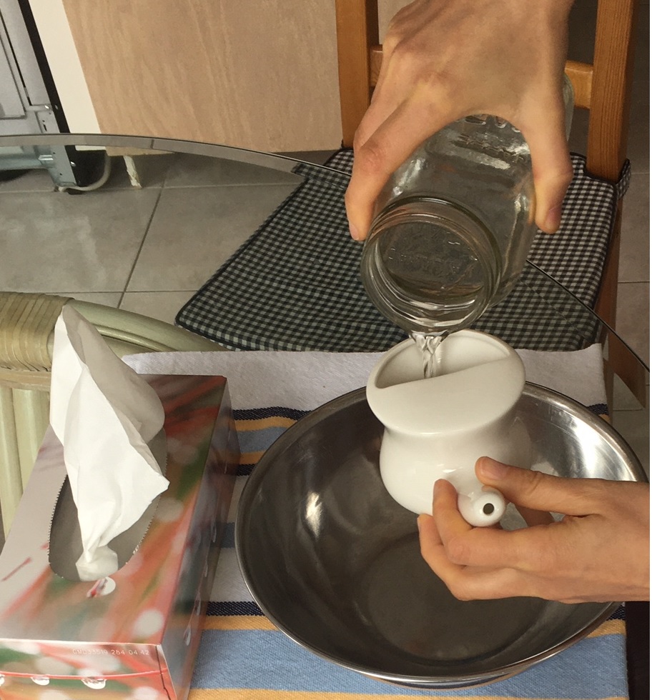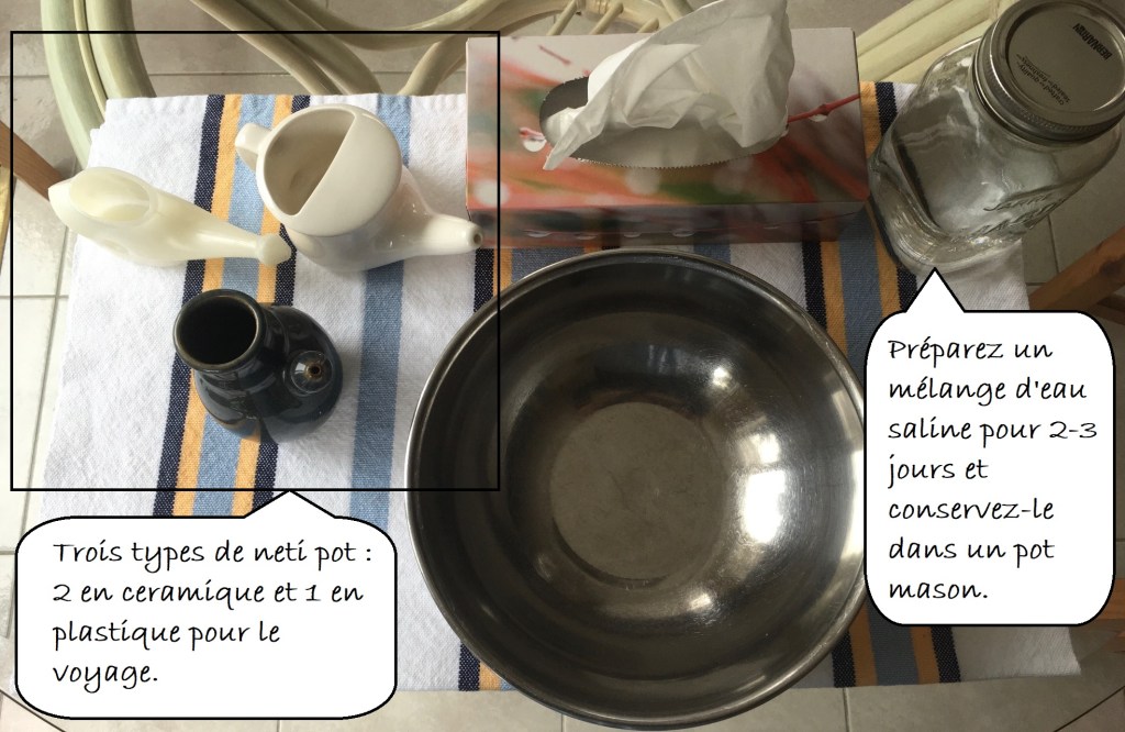 Matériel : Neti pot (ou lota), lavabo ou bol, mouchoirs, eau saline